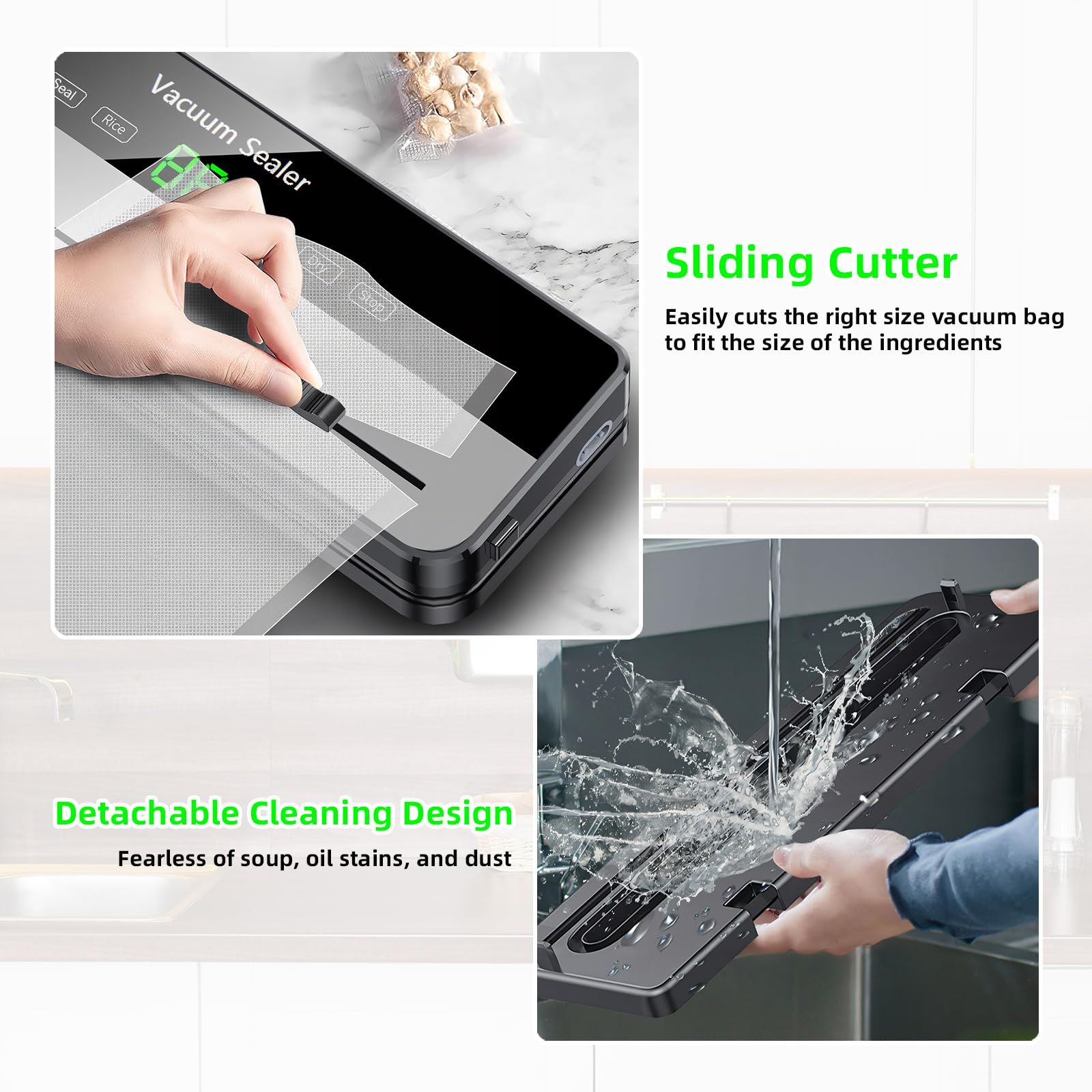 Function | Vacuum Sealing, Dry & Wet Dual Use, External Cutter, UV Sterilization |